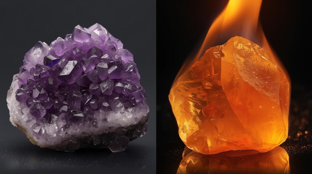 また、アメジストが持つ「癒し」「調和」「直感」のエネルギーが、高温の熱(火のエネルギー)と出会うことで、「活性化」「情熱」「富」といったシトリンが象徴するエネルギーに「変容」した、とポジティブに解釈することもできます。