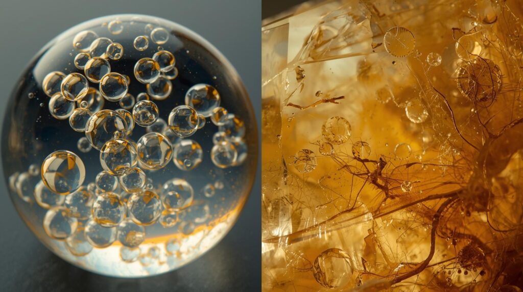 ガラス製の偽物にも気泡が見られることがありますが、それらは天然石の内包物とは明らかに異なります。