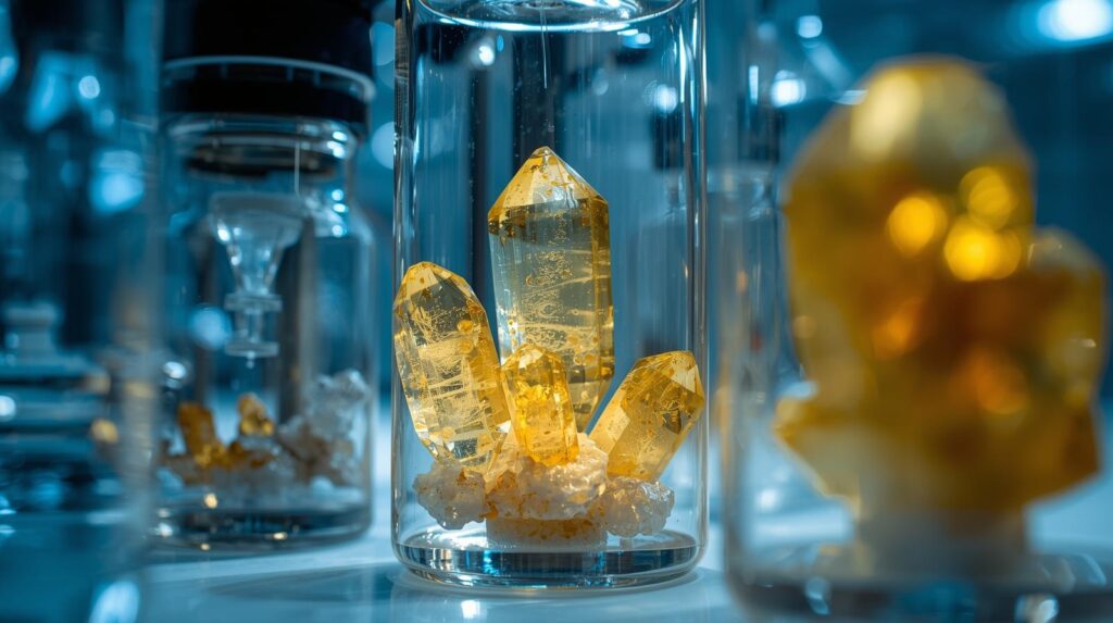 「水熱法」などの技術を用いて作られ、天然のシトリンとほぼ同じ化学組成と結晶構造を持っています。
