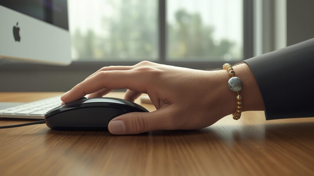 右利きの方がブレスレットを右手に着けると、文字を書く時やマウス操作時に邪魔になったり、デスクや壁にぶつけて石を傷つけてしまったりするリスクが高まります。