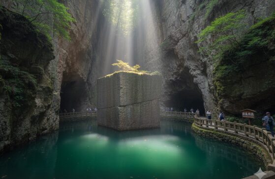 石の宝殿は、三方を岩壁に囲まれた空間に鎮座しており、底部には常に水が溜まっています。この水が光を反射することで、巨石が水面に浮かんでいるように見えるのです。