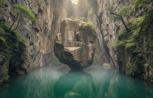 この石が水に浮いているように見える理由は、岩盤のくぼみにたまった水が反射するためであり、自然光の具合や角度によっては本当に宙に浮いているような錯覚を生み出すのです。